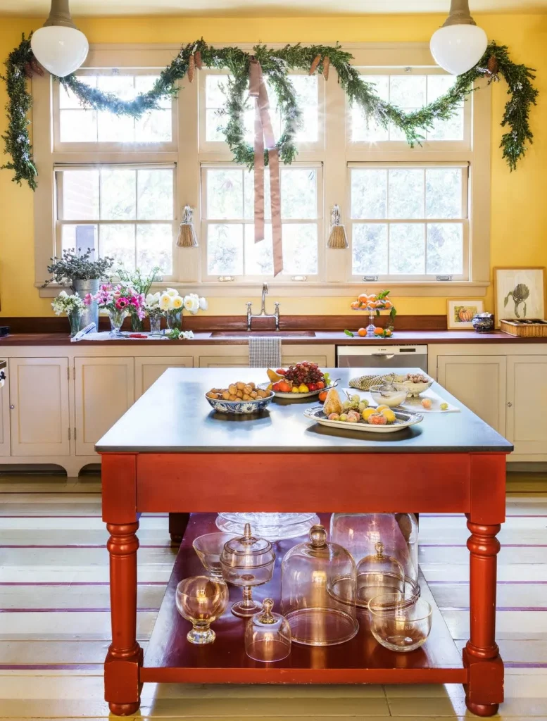 در آشپزخانهای در ایالت کالیفرنیا، طراح فضای داخلی برای هماهنگی با مناظر طبیعی بیرون از خانه، از سه طیف مختلف زرد متمایل به سبز و یک سبز روشن روی سقف استفاده کرده است. نتیجه، فضایی گرم، طبیعی و آفتابی است که با چشم همخوانی دارد.