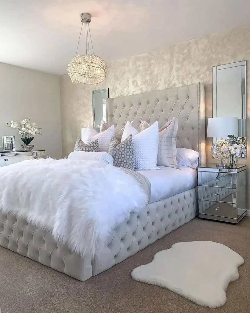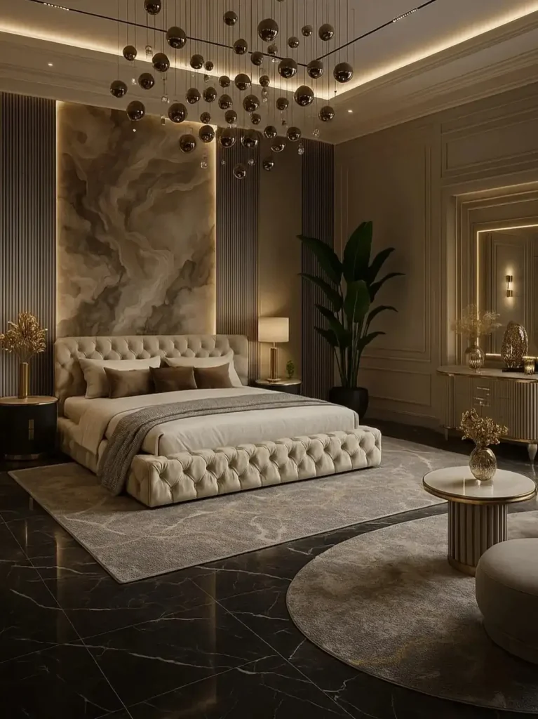 این اتاق خواب دقیقاً حس «لوکسِ آروم» میده. تخت لمسهدوزیشده، بالشهای لایهلایه، پاتختیهای آینهای و چراغ آویز کریستالی، همگی گلم هستن، ولی نه اون مدل پرزرقوبرقِ قدیمی. رنگهای کرمی و ملایم باعث میشن فضا شیک باشه، اما توی چشم نره.
