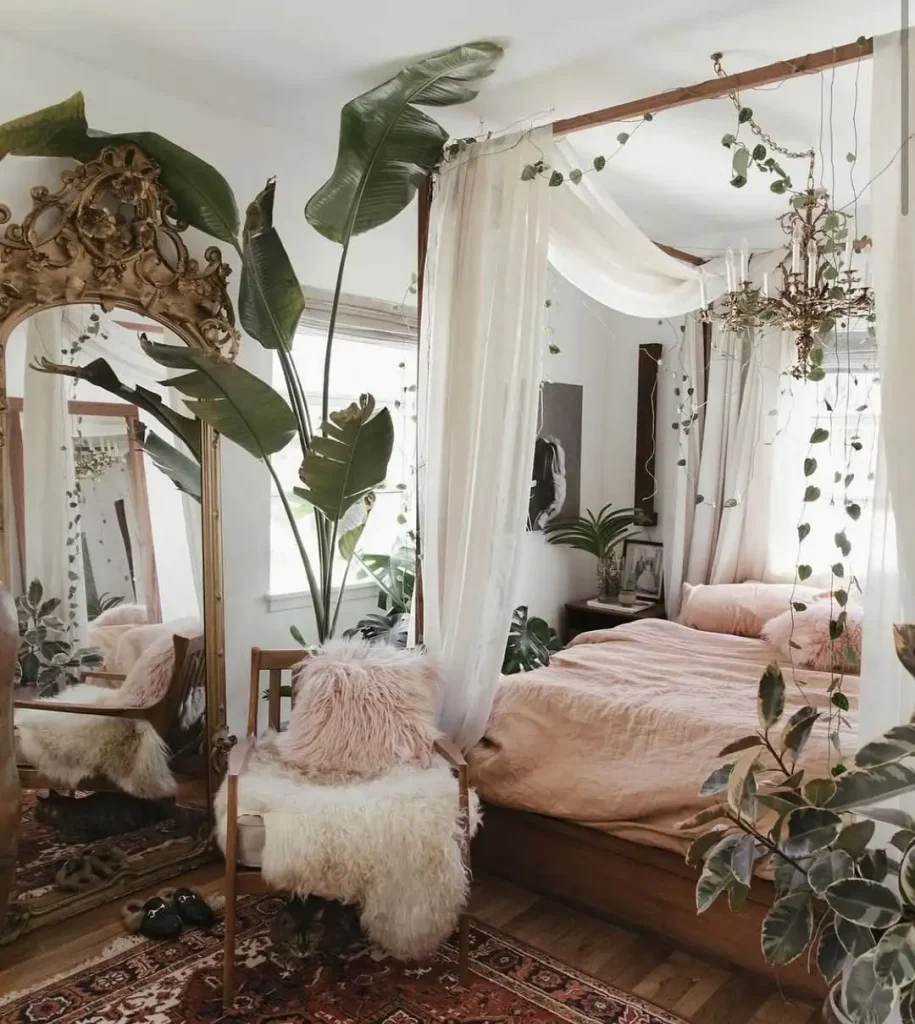ملحفههای صورتیِ ملایم، گیاههای آویز، آینهی قدیمی با کلی خاطره… این فضا انگار بوی گل و کتاب کهنه میده. پردههای تخت مثل یک قاب، تخت رو میبره توی دنیای خودش.