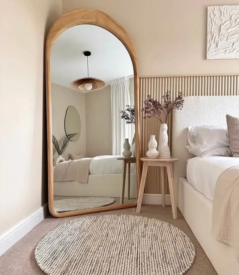 خنثی روی خنثی، ولی جذاب. آینهی قوسی بزرگ و چوبهای ملایم باعث میشن اتاق گرم بمونه، نه بیروح. هیچچیز زیاد نیست، ولی هیچچیز هم کم گذاشته نشده.