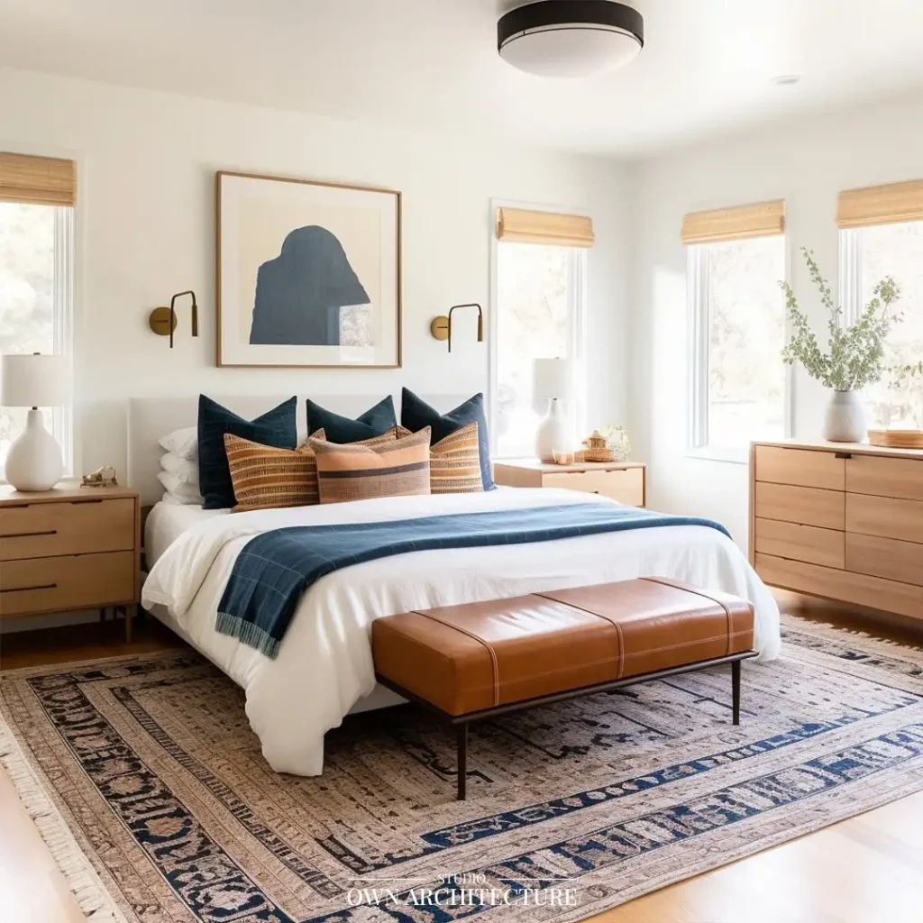پتوهای بافتدرشت و چهارپایههای کوتاه و منحنی، سختی خطوط رو نرم میکنن. اتاق شیکه ولی سختگیر نیست؛ مثل یک هتل بوتیک که آدم دلش میخواد ازش کپی کنه.