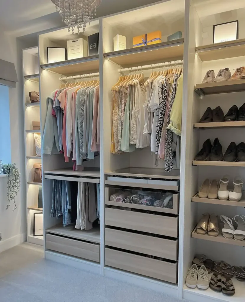 این کمد دقیقاً همان چیزی است که بهش میگن «هدفهای زندگی». قفسههای باز، نور مخفی ملایم، چوبلباسیهای مرتب و ردیفشده… حسِ اتاق پرو بوتیک میدهد، بدون اینکه لازم باشد اتاق جدا برای لباس داشته باشی. کشوهای چوب روشن و بخشهای دردارِ شیشهای هم باعث میشوند فضا سبک و خلوت بماند، نه شلوغ و سنگین.