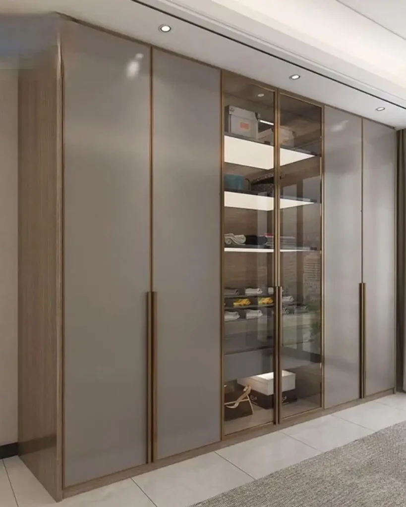 این یکی درام را خیلی درست اجرا کرده. پنلهای ماتِ طوسی، یک بخش شیشهای برای نمایش و نور گرم داخل کمد… یعنی ارتقای فوری. خطهای عمودیِ تمیز ظاهرش را مدرن نگه میدارد و قفسههای نورپردازیشده همان حس لوکسِ هتلهای خوب را میدهد.