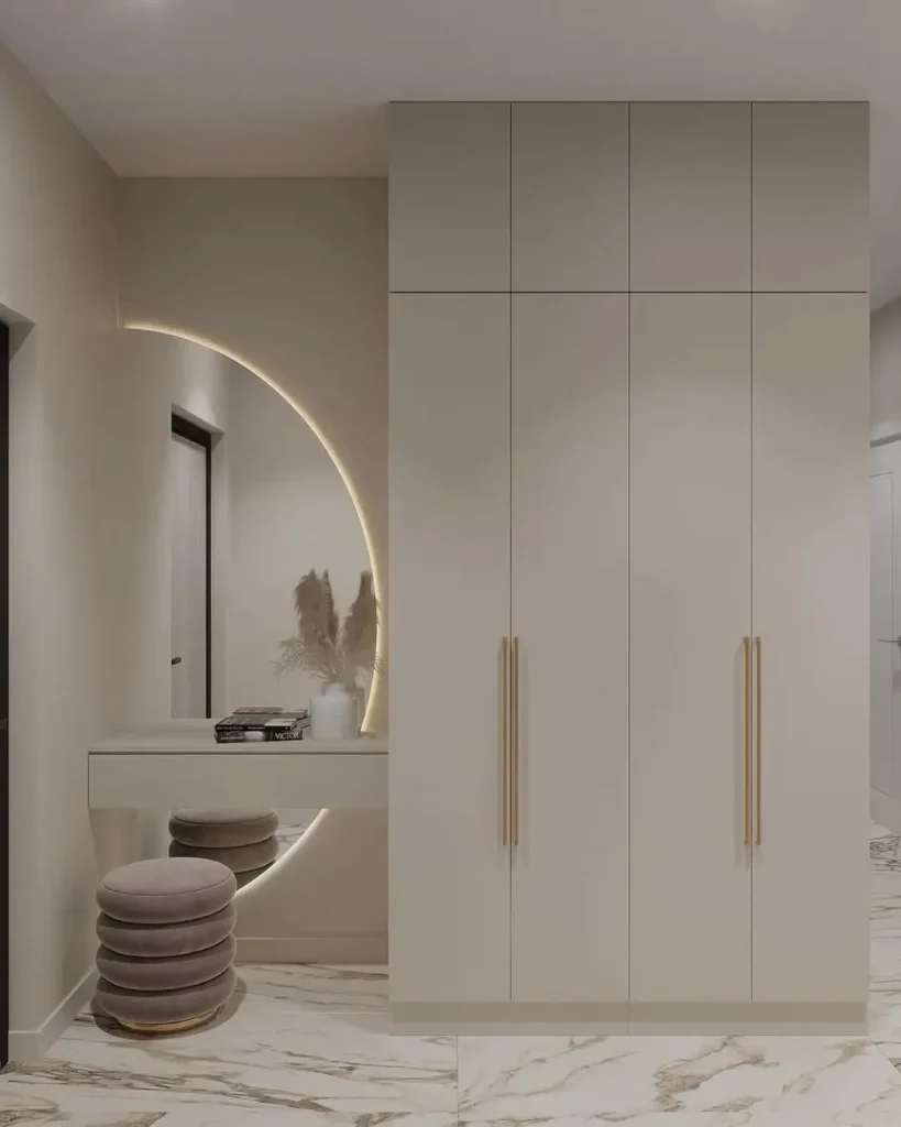 اینجا کمد کمی عقب میرود تا میز آرایش بدرخشد. آینه قوسیِ بزرگ با نور مخفی یک هالهی نرم میسازد که همهچیز را زیباتر نشان میدهد. پنلهای بلندِ کرم با دستگیرههای طلایی باریک هم ظاهر را آرام و یکدست نگه میدهند.