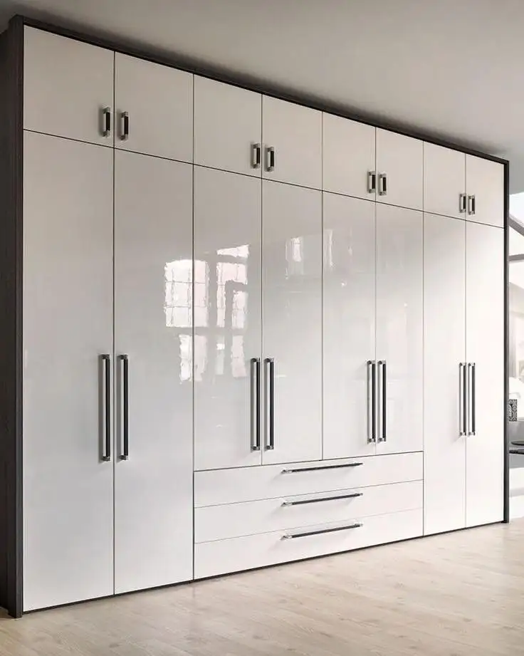 اگر ظاهر براق دوست داری، این دیوارِ سفیدِ درخشان کاملاً به کارت میآید. سطح بازتابنده نور را میگیرد و اتاق را بزرگتر نشان میدهد، درحالیکه پشت این ظاهر مرتب، کلی کشو و در و تقسیمبندی برای نظم واقعی پنهان شده.