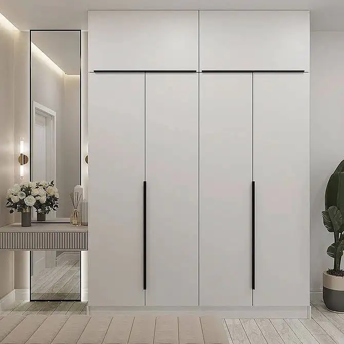 این کمد روی خنثیهای ملایم تمرکز دارد و دستگیرههای مشکی بلند مثل یک خط تمیز روی درها مینشیند. نمای مینیمال باعث میشود تقریباً نامرئی شود و خیلی نرم در دیوار حل شود، اما همچنان اتاق را محکم و مرتب نگه میدهد.