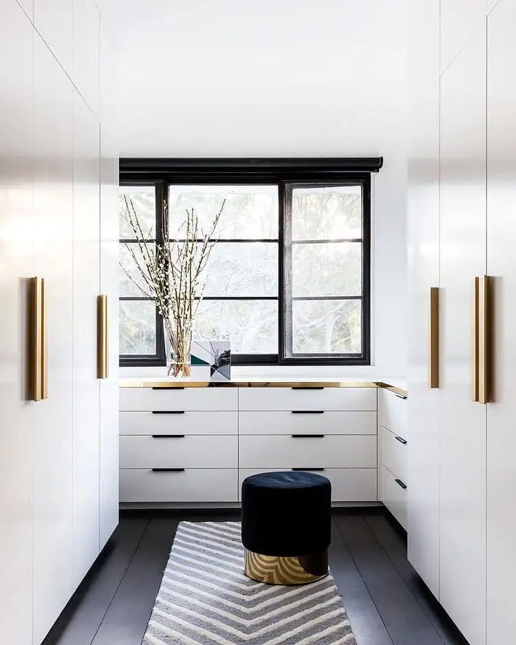 این چیدمان بیشتر شبیه یک فضای لباس پوشیدن است تا یک کمد معمولی. کابینتهای سفید دو طرف قرار گرفتهاند و نگاه را به سمت پنجره میبرند، با یک کشوخانه جمعوجور زیر پنجره.