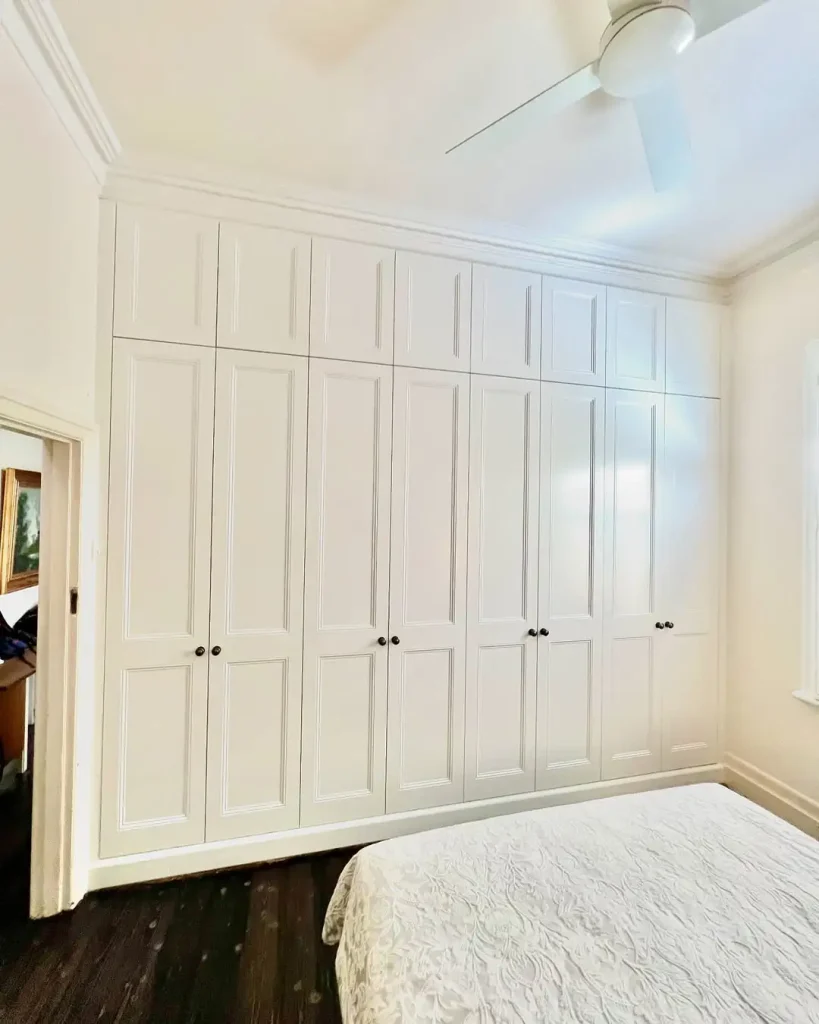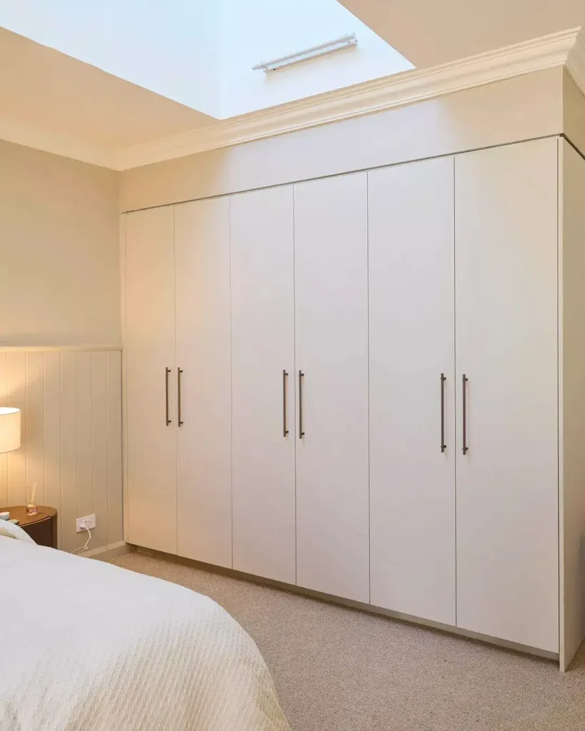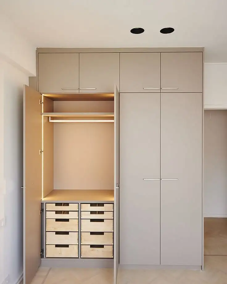کمدهای توکارِ قدی تا سقف، با درهای ساده و روشن بهترین انتخاباند؛ هم از فضای عمودی استفاده میکنند هم اتاق را شلوغتر نشان نمیدهند.