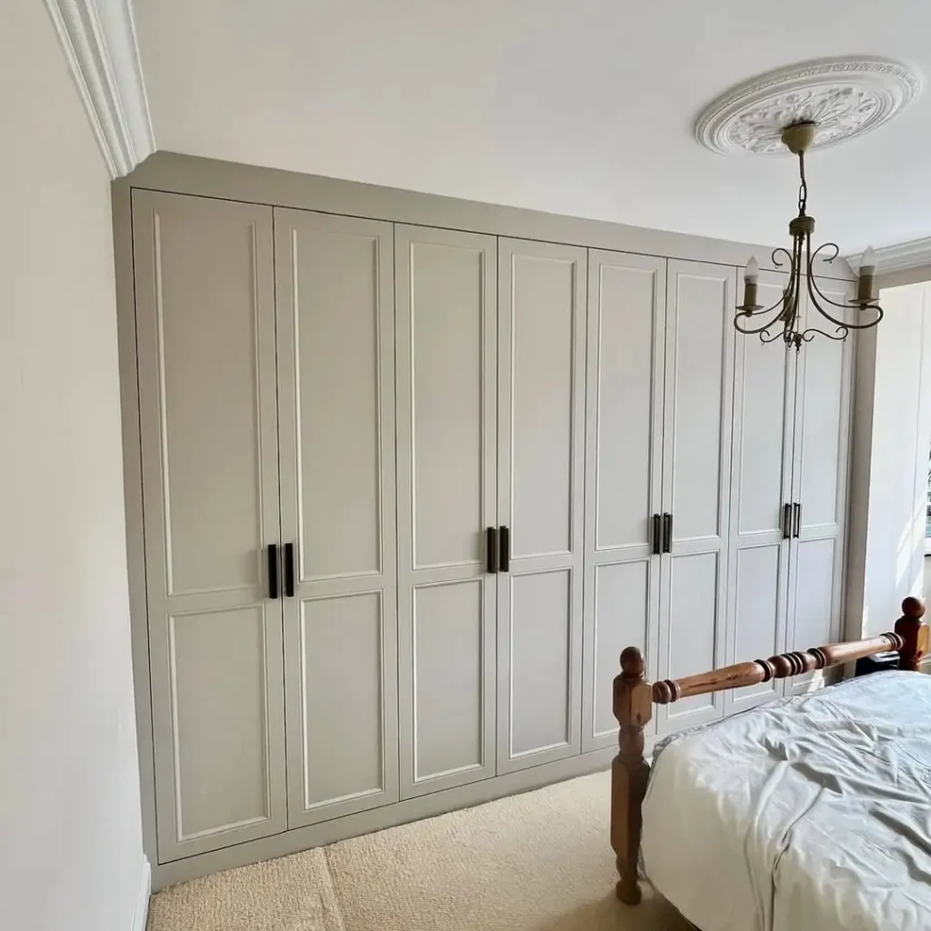 پنلهای شِیکرِ قدی با رنگ «خاکیِ روشن»، حس کلاسیک و باوقاری به اتاق میدهند. جزئیات قاببندی ظریف اما محکم است، مخصوصاً کنار دستگیرههای تیره و لوستر سنتی بالای سر.