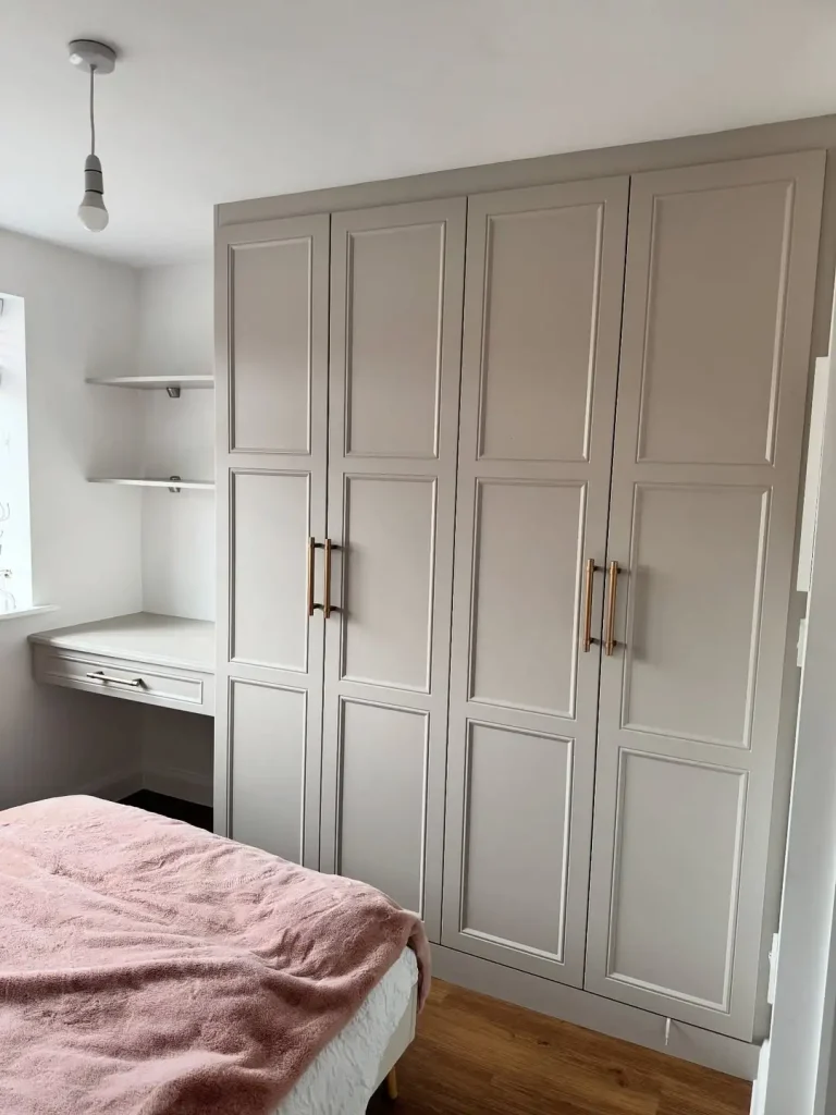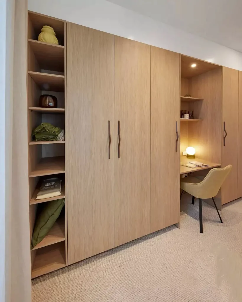 رنگهای خنثیِ ملایم با دستگیرههای برنجیِ ساده، این کمد را مدرنتر و شیکتر کرده. بخش میز توکار هم برای اتاقهای کوچک عالی است؛ وقتی هر سانت مهم است، چنین گوشهای واقعاً نجاتدهنده است.