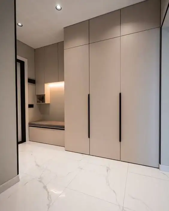 پنلهای بژ ملایم با دستگیرههای مشکی بلند، یک ظاهر آرام و امروزی میسازد که حس «لوکسِ بیادعا» دارد. نیمکت توکار کنار کمد هم باعث میشود کل دیوار یکپارچه و هدفمند به نظر برسد، نه چیزی که بعداً اضافه شده.