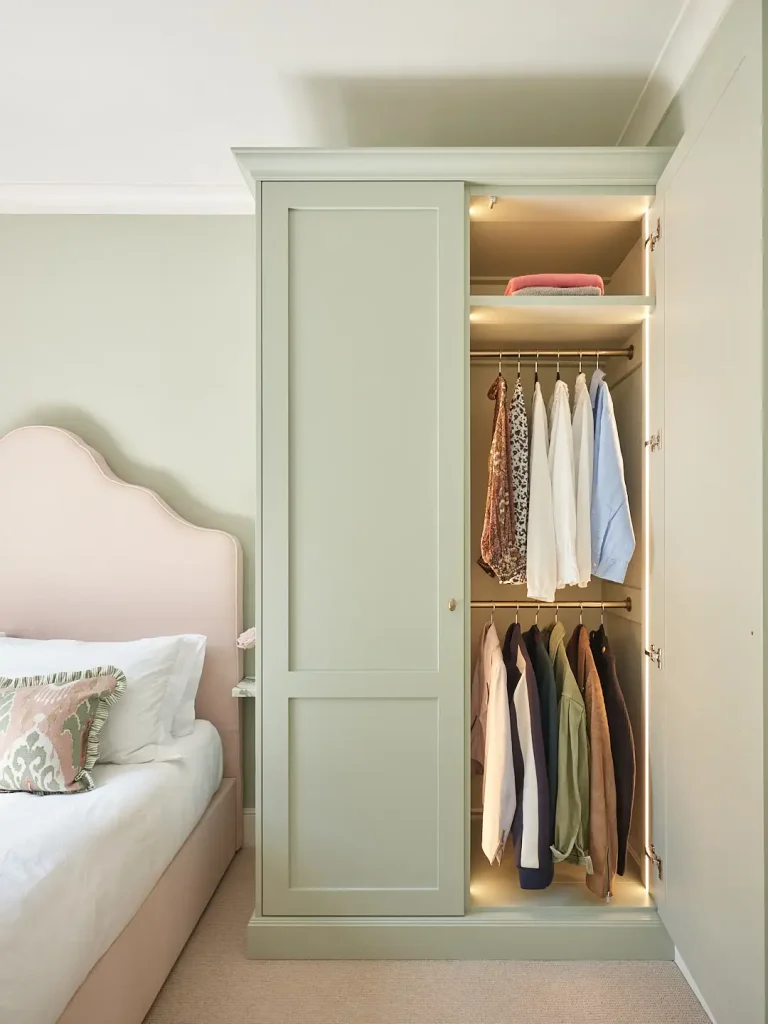 کابینتهای سبزِ ملایم با قاببندی سنتی، واقعاً همیشهزمانیاند. ریل دوبل برای آویز لباس فضا را حداکثر میکند، اما آن رنگ آرام و تاجکاری بالای کمد است که کار را کامل میکند.