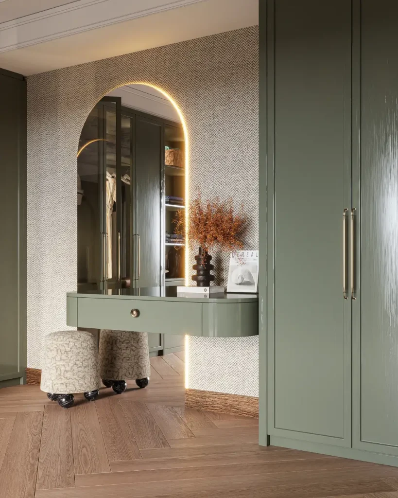 این یکی دیگر فقط «کمد» نیست؛ یک صحنه کامل است. میز آرایش توکار با آینه قوسیِ نورانی، تمام توجه را میگیرد و کابینتهای زیتونی هم فضا را غنی و متعادل نگه میدارند.