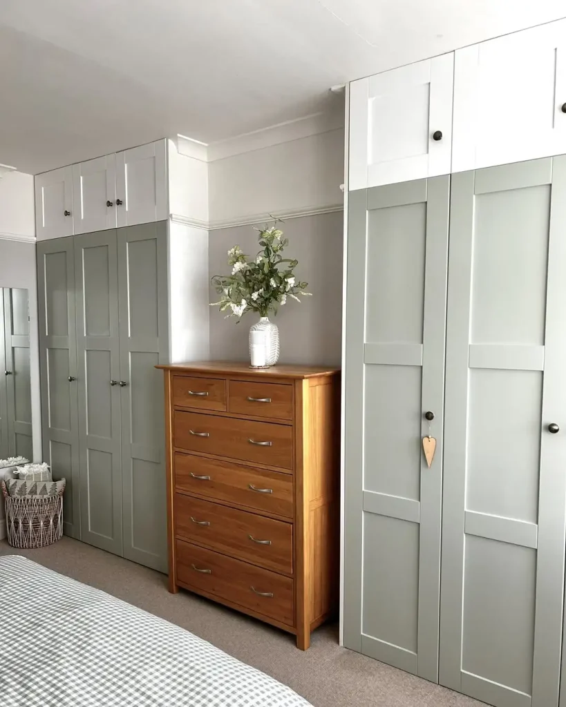 ترکیب سبزِ آرام و سفید واقعاً آرامشبخش است. وقتی وسطش با یک تکه مبلمان چوبی گرم ترکیب میشود، تعادل قشنگی بین کمد توکار و حسِ کمدهای آزاد ایجاد میکند.