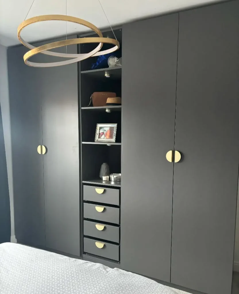 پنلهای تیرهی مات با دستگیرههای طلاییِ گرد؟ خیلی جذاب. قفسههای بازِ وسط هم یک شکستِ خوب بین درهای یکپارچه میسازد و جای کمی دکور و چیدمان میدهد.