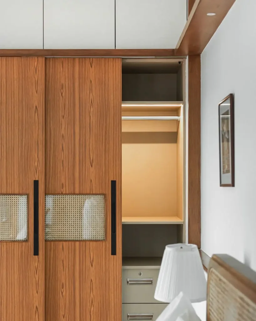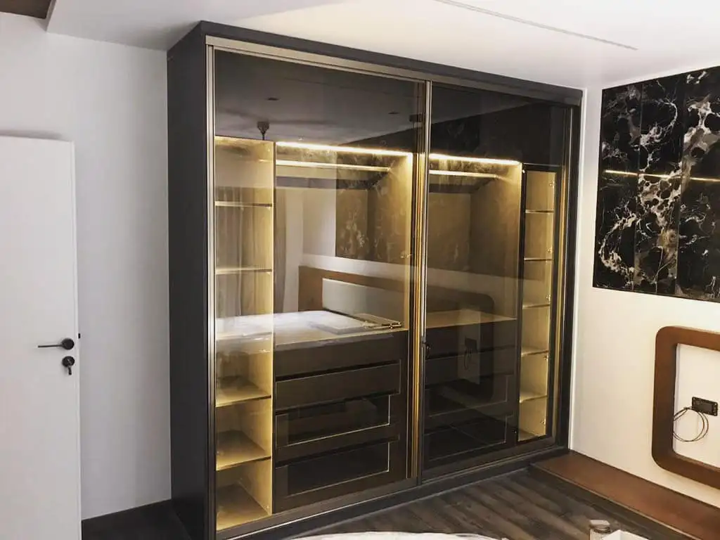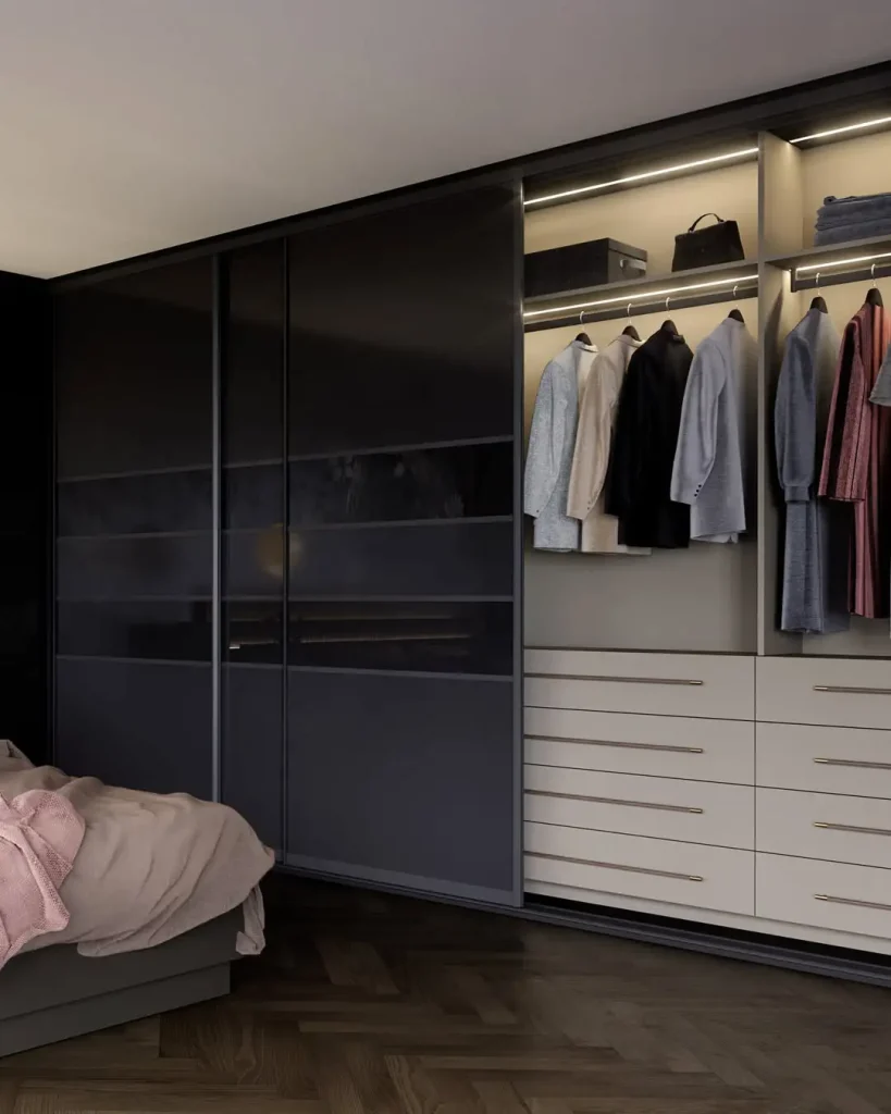 پنلهای شیشه مات مثل مهِ نازکی روی شیشهان: خنک، مدرن، شیک. ولی وقتی در رو باز میکنی، یک فضای داخلی دقیق و مرتب میبینی: کشوهای تمیز، ریلهای لباس مرتب، و نور داخلی که همهچیز رو حرفهایتر میکنه.