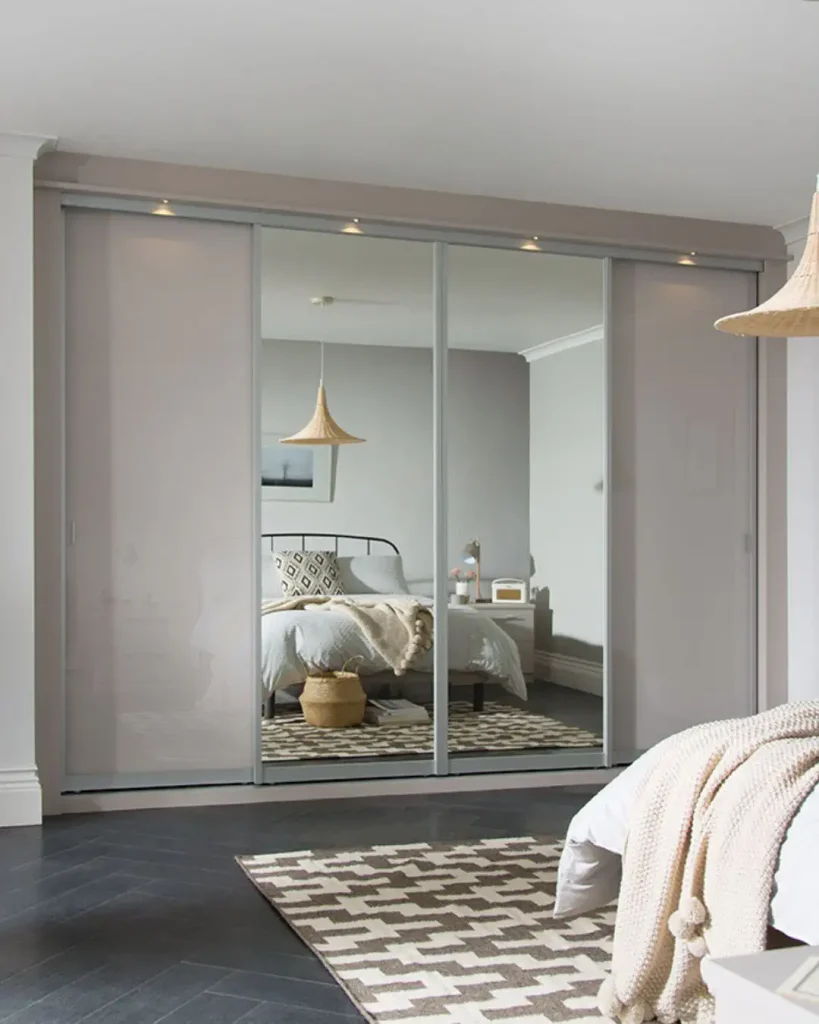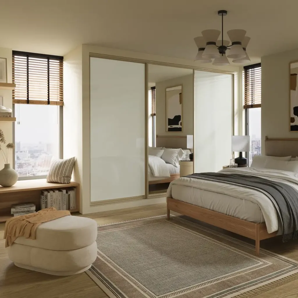 یک ترکیب مطمئن: یک درِ آینهای برای نور و کاربرد، و چوب برای گرما و آرامش. نتیجه یک کمد متعادل است که هم قشنگ است هم بیدردسر.