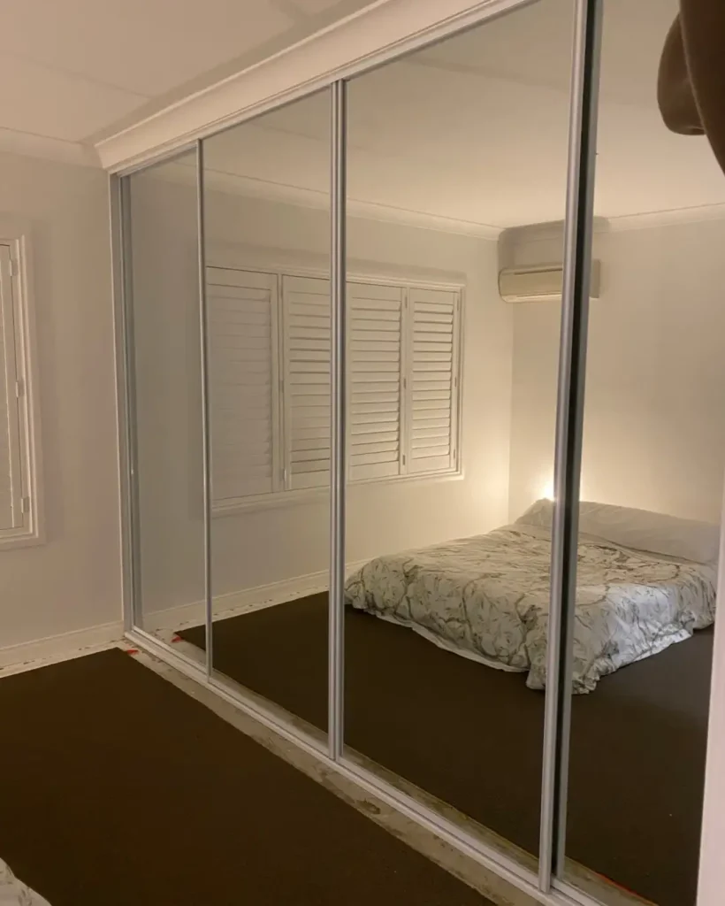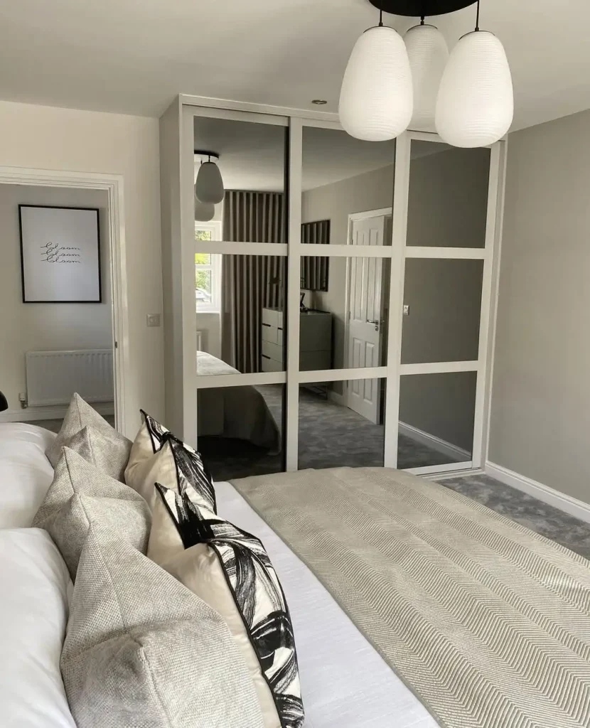 کمد آینهای اینجا فقط آینه نیست، یک عنصر معماریه. فریم مشکی دور آینهها، به کمد فرم میده و در عین حال، نور روز رو توی اتاق پخش میکنه.