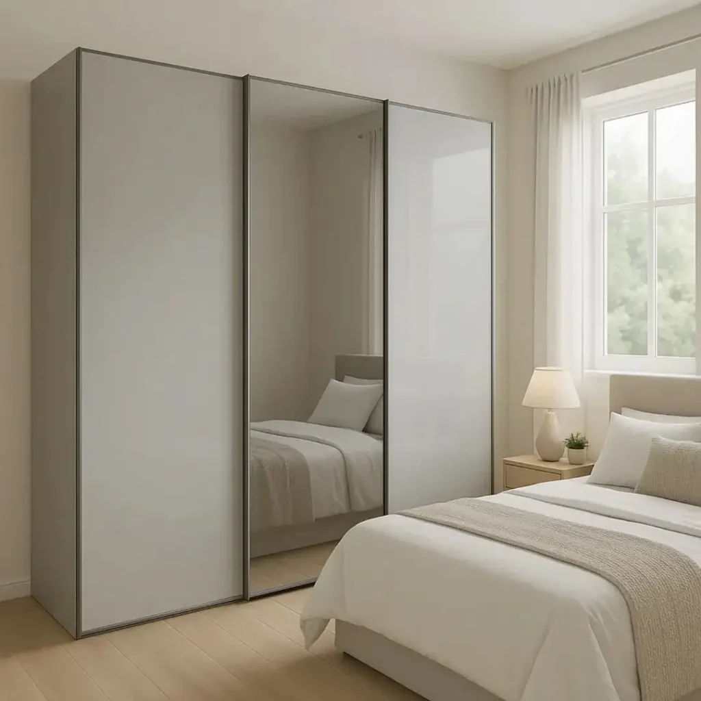 اگه یک کمد قرار باشه هم «ترفند طراحی» باشه هم کمد، این همونه. سیستم سهتکه دارد: دو پنل مات و یکی آینهای. همین ترکیب باعث میشه اتاق در لحظه بزرگتر و روشنتر دیده بشه.