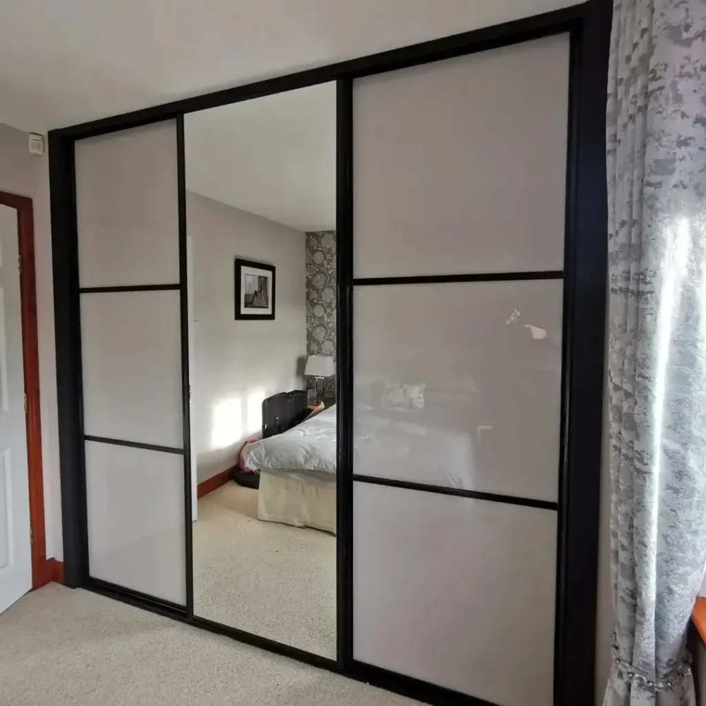 پنلهای روشن کنار فریم مشکی، یک تضاد تمیز و مدرن میسازد. آینه وسط هم هم کاربردی است هم نقطه کانونی.