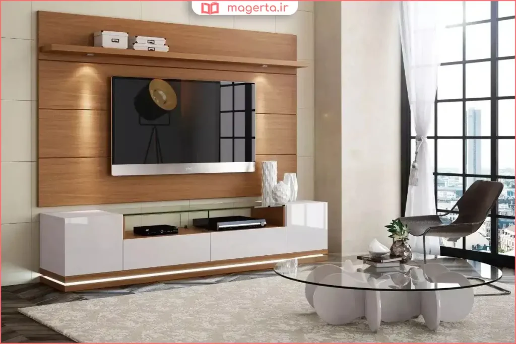 دیوارهای روشن: می‌توانید از میز تلویزیون سفید، کرم، فیلی یا قهوه‌ای استفاده کنید.