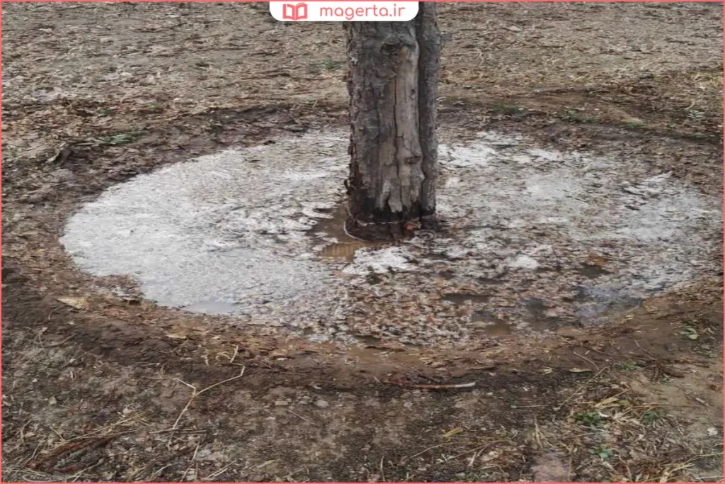 مالچ‌پاشی: پوشاندن سطح خاک اطراف درخت با مالچ (مانند کاه و کلش) به حفظ رطوبت خاک و کاهش تبخیر کمک شایانی می‌کند.