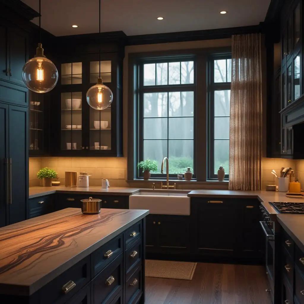 یک حس سینمایی در این آشپزخانه هست. کابینتهای مشکیِ جوهری دور تا دور فضا را گرفتهاند و لامپهای آویزِ گرم، نور طلایی روی جزیره میریزند. سینک روستیک زیر پنجره شبکهای هم یک حس ماندگار و کلاسیک میدهد، مخصوصاً وقتی کنار پالت تیره قرار میگیرد.