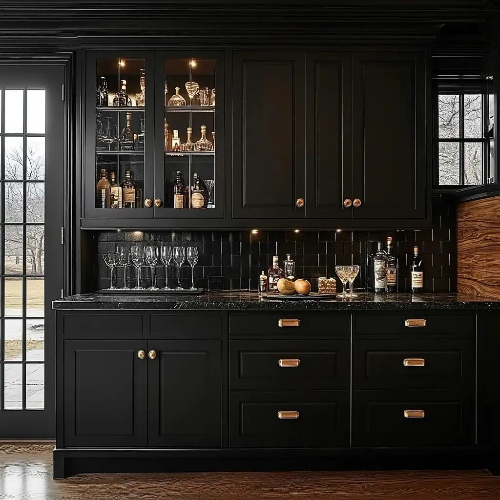 این بار توکار مشکی مثل یک گوشهی مخفی و جذاب است. کابینتهای شیشهای از داخل نور میگیرند و بطریها و لیوانها را روی بکاسپلش کاشی مشکی براق برجسته میکنند.