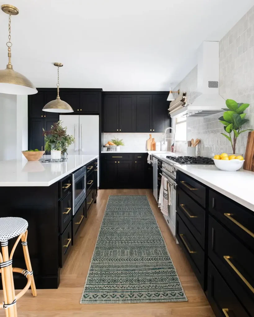 این نسخه کمی تیرهتر و جدیتر است. کابینت مشکی، کف روشن و یک قالیچه ساده وسط مسیر، یک جریان خطی تمیز میسازد. چراغهای برنجی هم همان مقدار درخشش میدهند که پالت رنگی خشک نشود.
