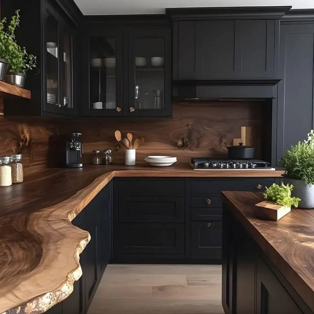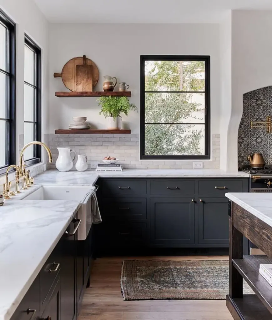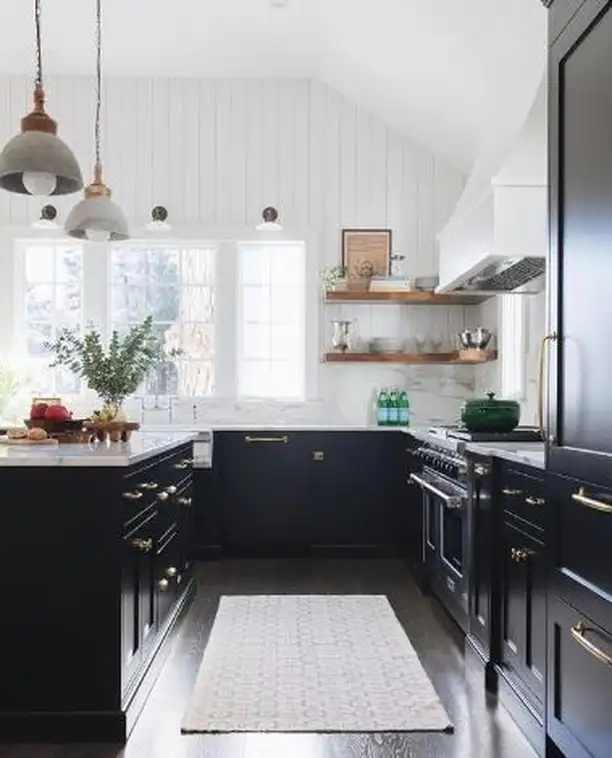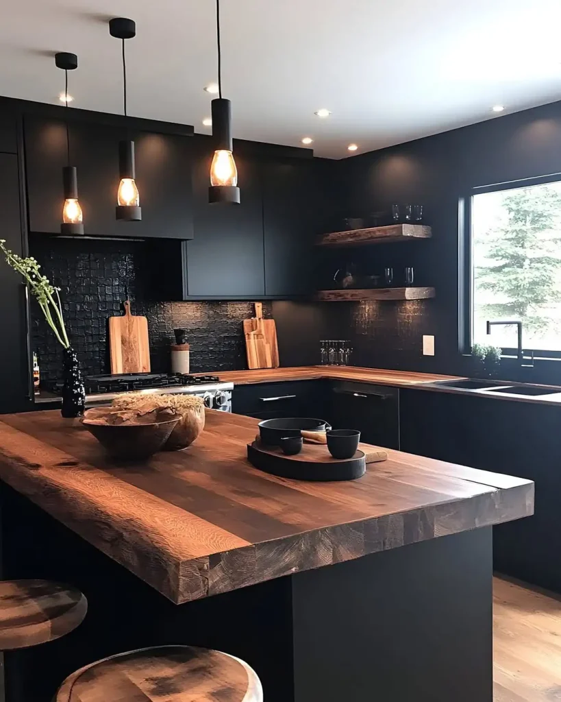 این یکی ثابت میکند کابینت مشکی و حس روستیک کاملاً با هم جورند. دیوارهای چوبی شیاردار، قفسههای چوبی باز و نور طبیعی نرم، تعادل عالی با کابینتهای تیره میسازند. نتیجه زمینی، دنج و کمی نوستالژیک است.