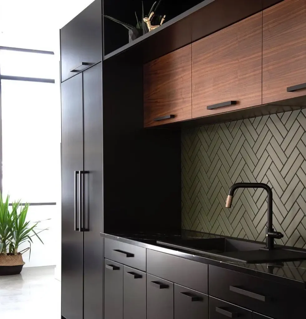 اینجا همهچیز درباره جزئیات است. کابینتهای مشکی شیک با کابینتهای چوبی بالایی و دستگیرههای مدرن ترکیب شده و نتیجه یک سبک امروزی میشود که سرد و بیروح نیست.