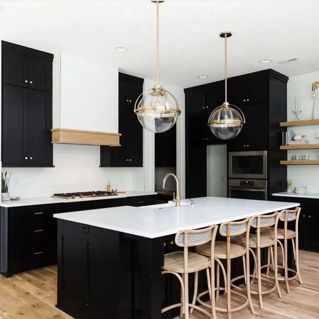 ترکیب همیشگی مشکی و سفید اینجا عالی اجرا شده. جزیره بزرگ، چراغهای کروی و چهارپایههای چوبی روشن باعث میشوند فضا باز و خوشآمدگو بماند.