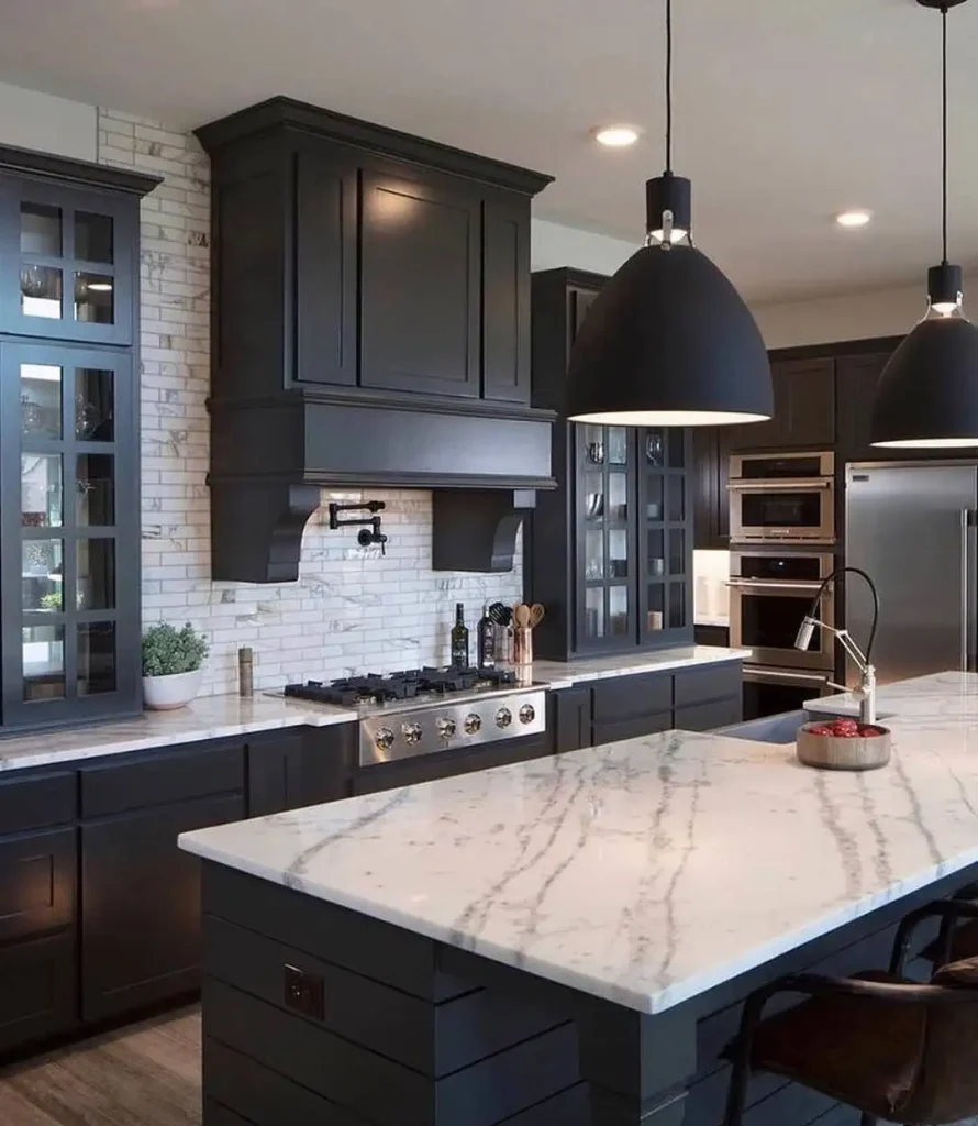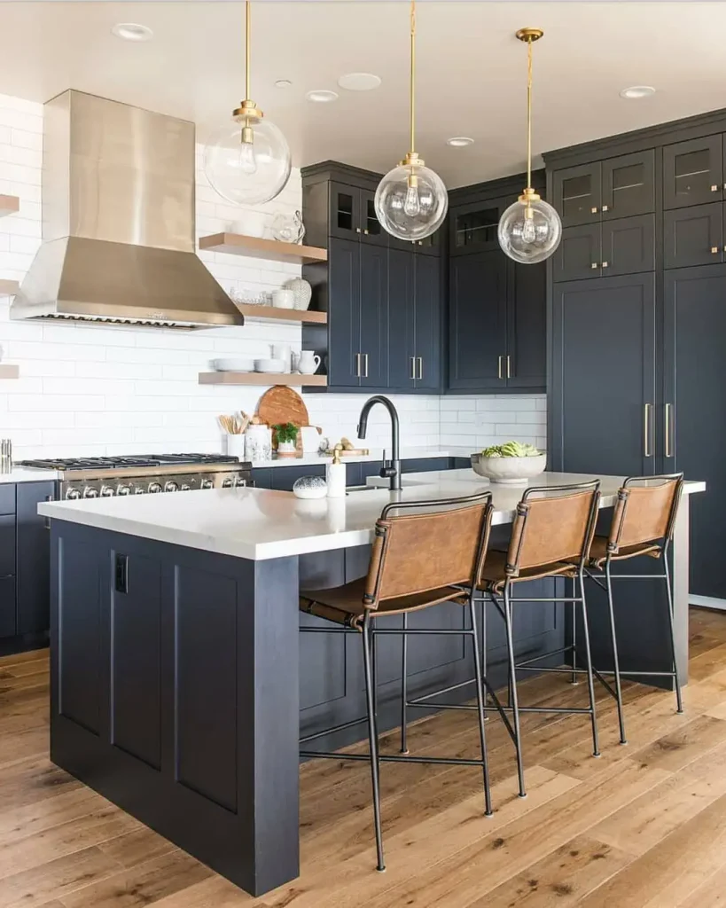 کابینت تیره با چراغهای شیشهای بزرگ؟ شیکِ فوری. بکاسپلش و صفحههای سفید فضا را روشن میکنند، اما اجازه میدهند مشکی همچنان مرکز توجه باشد.