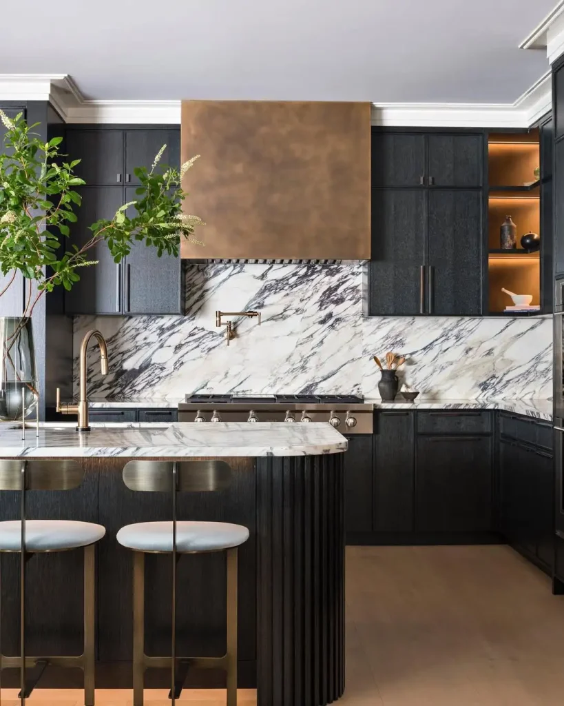 بکاسپلش مرمر پررگه کنار کابینت مشکی عمیق، واقعاً لوکس است. شیر برنجی و هود، گرما اضافه میکنند تا فضا یخ و سرد نشود.