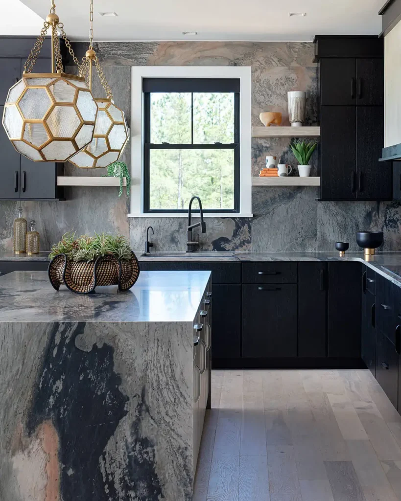 بکاسپلش سنگی اینجا واقعاً کار اصلی را انجام میدهد. رگههای خاکستری و زغالی پشت کابینتهای مشکی حرکت میکنند و چراغهای آویز ششضلعی، نور گرم میدهند.