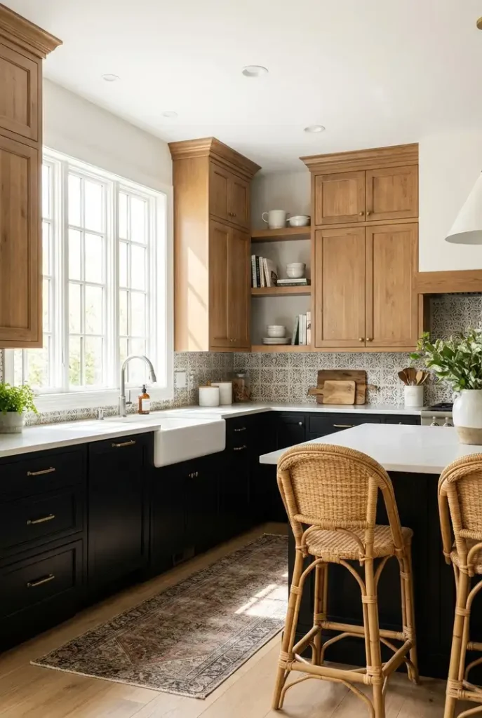 کابینت تیره کنار کف چوبی بافتدار و بکاسپلش خنثیِ روشن، یک روستیک خوشسلیقه میسازد. مشکی اینجا محکم و کلاسیک است، نه یک مد زودگذر.