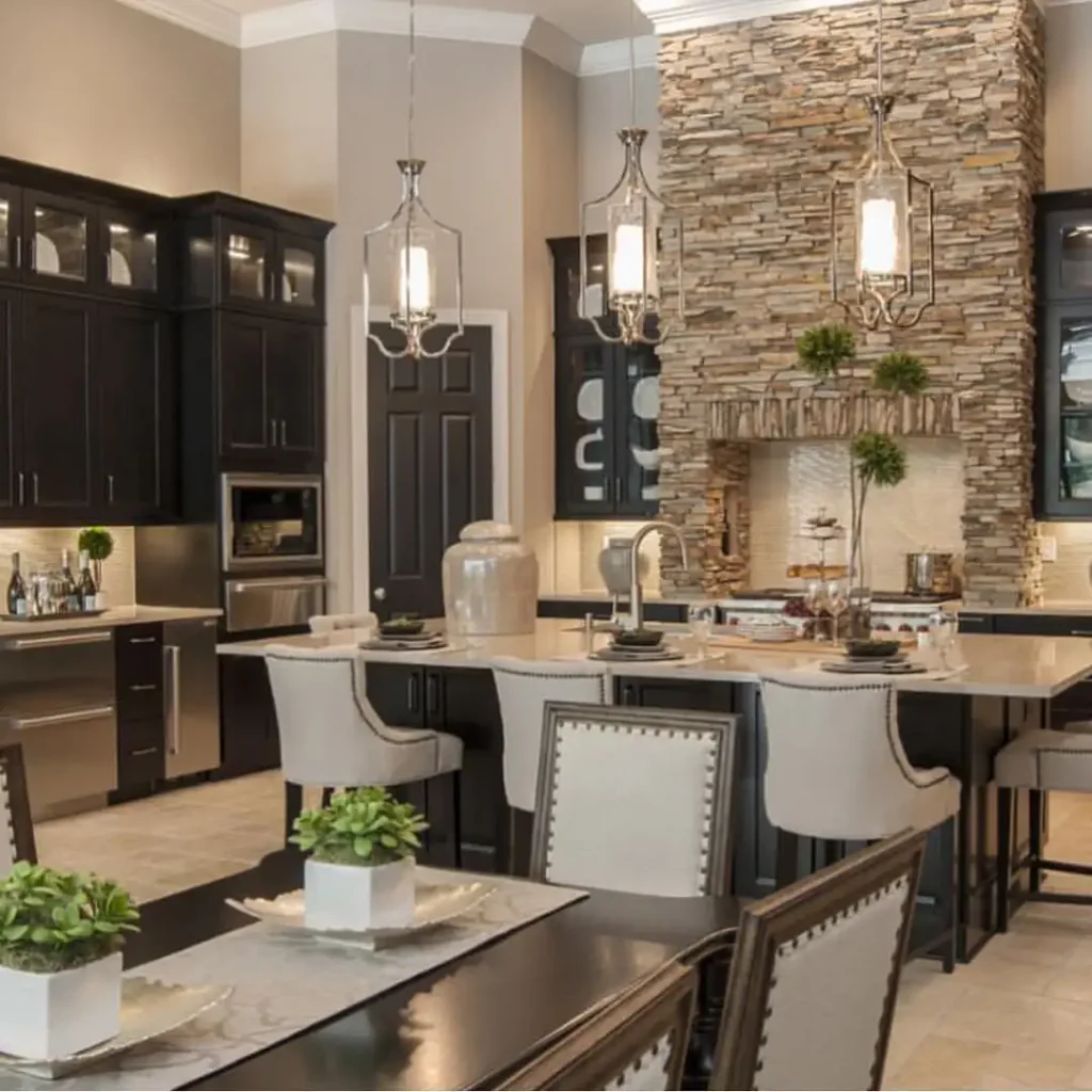 سقف بلند، دیوار سنگی لایهلایه و کابینتهای قهوهای خیلی تیره متمایل به مشکی، این آشپزخانه را بزرگ و لوکس میکند. صندلیهای جزیره و چراغهای آویز فانوسی هم یک حس رسمیتر به فضا میدهند.
