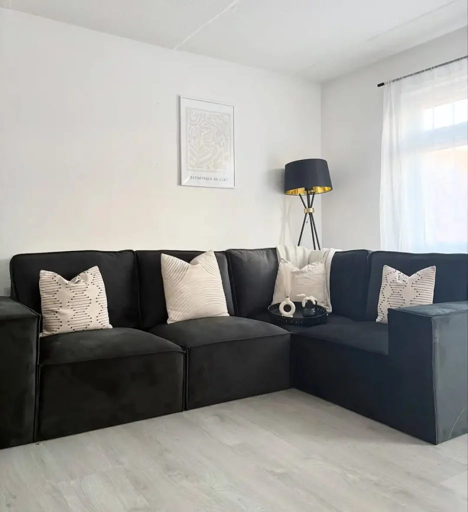 این مبل الشکل مشکی، آروم و مطمئن توی فضا نشسته و بدون اینکه زور بزنه دیده میشه. کنار دیوارهای سفید و کف روشن، تبدیل میشه به تکیهگاه اصلی اتاق، ولی فضا رو سنگین نمیکنه. چیدمان هم سادهست، اما سرد نیست؛ همون کوسنهای نرم و راحت، گرما رو میارن توی تصویر.
