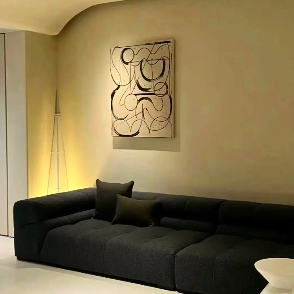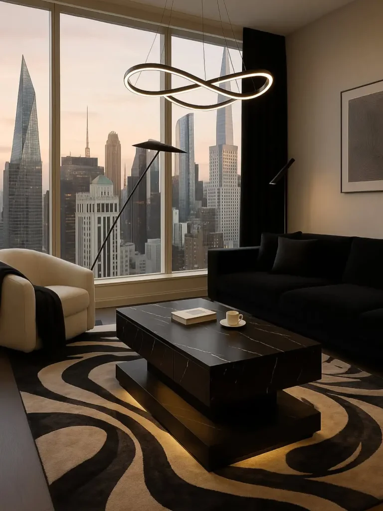 همهچیز اینجا حسابشدهست. مبل مشکی کمارتفاع با خطهای تمیز و تناسبات دقیق، یک حس لوکسِ بیسروصدا میسازه. مینیماله، ولی جزئیاتش غنیه.
