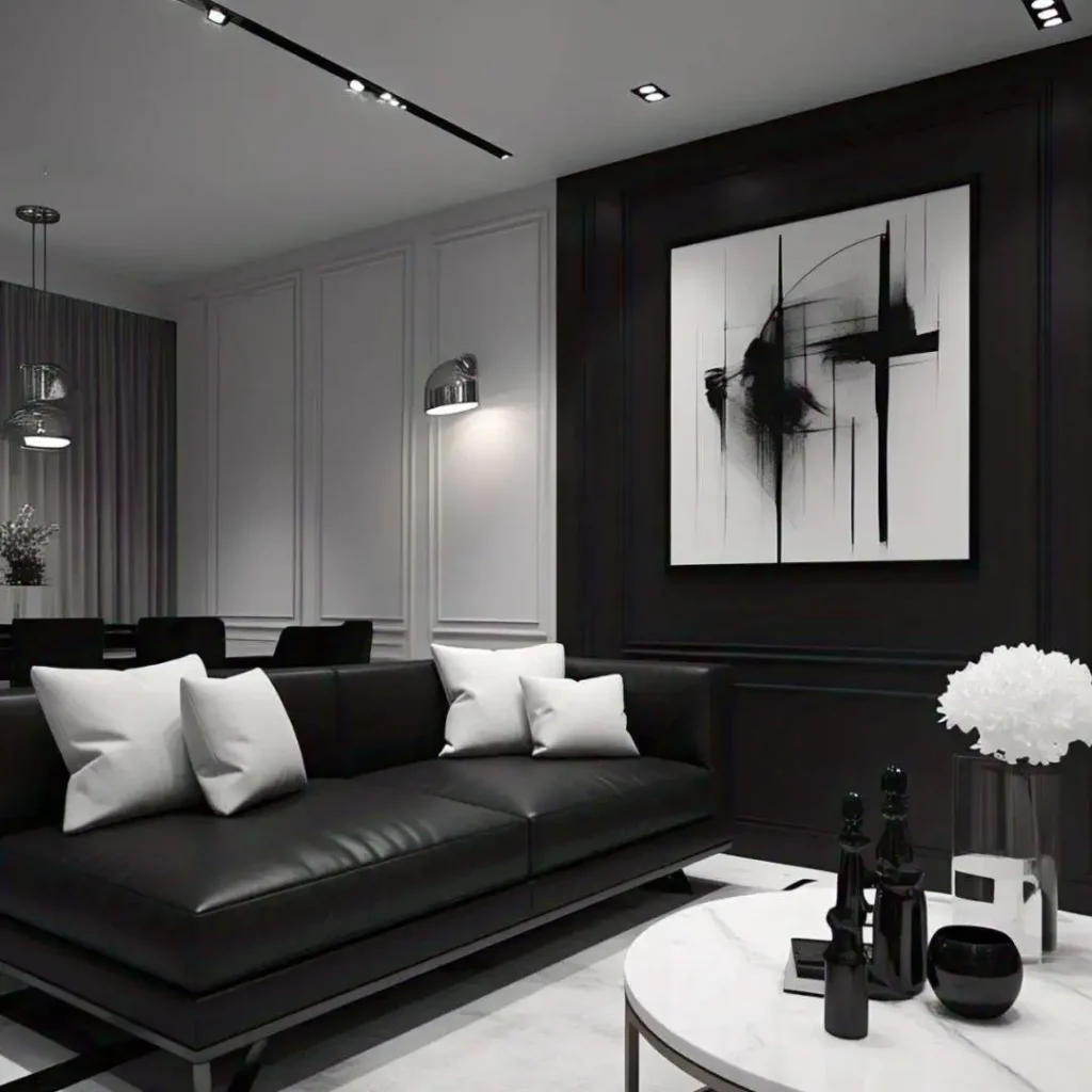 یک ترکیب مشکی روی مشکی که انرژی سردبیری و خیلی امروزی داره. دیوارهای تیره، دکوریهای مجسمهوار و یک مبل مشکی خوشفرم کنار هم میشن یک فضا با اعتمادبهنفس بالا.