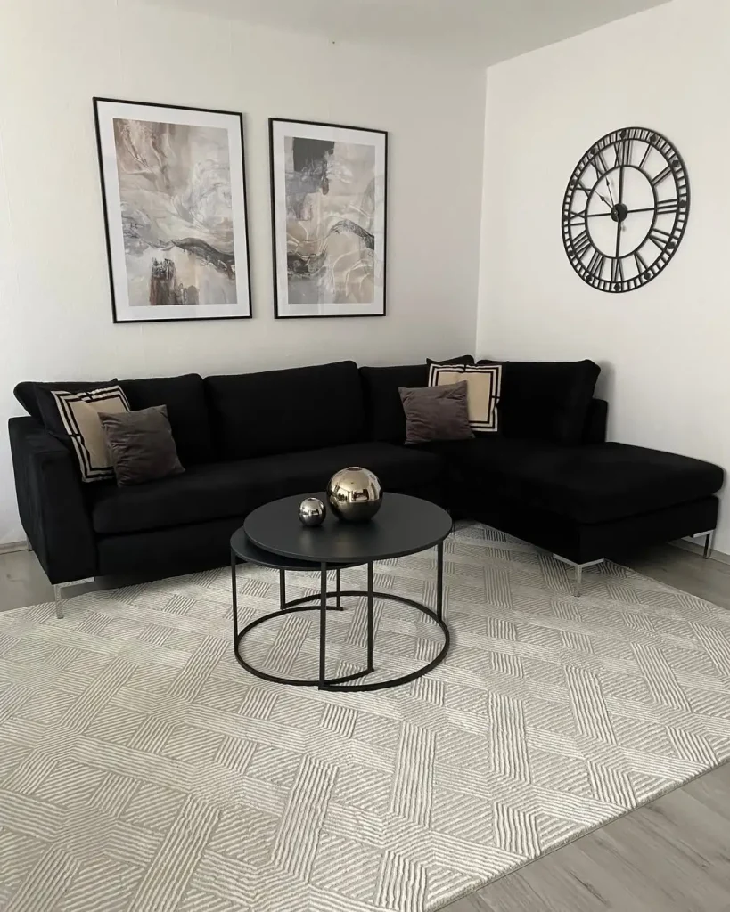 این مبل مشکی خطهای تمیز و ظاهر جمعوجور داره. کل اتاق هم طوری چیده شده که مرتب به نظر بیاد، ولی خشک و رسمی نشه.