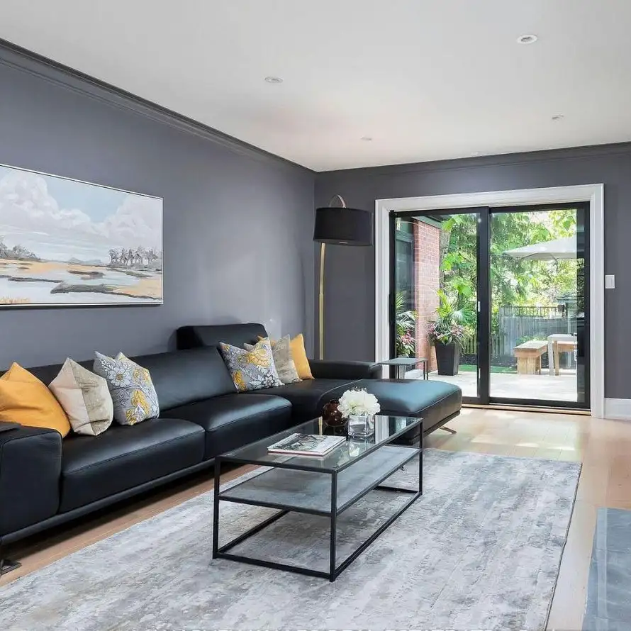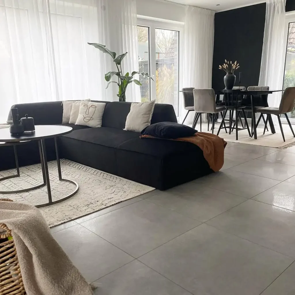 اینجا مبل مشکی دقیقاً همان کاری را میکند که بهترینش است: به فضای معماریدار عمق میدهد و اتاق را باوقارتر نشان میدهد. دیوارهای خاکستری، نورپردازی ساختارمند و مبلمان ساده، حس مرتب و رسمی ملایم میسازد، اما مبل فضا را همچنان مهماننواز نگه میدارد.