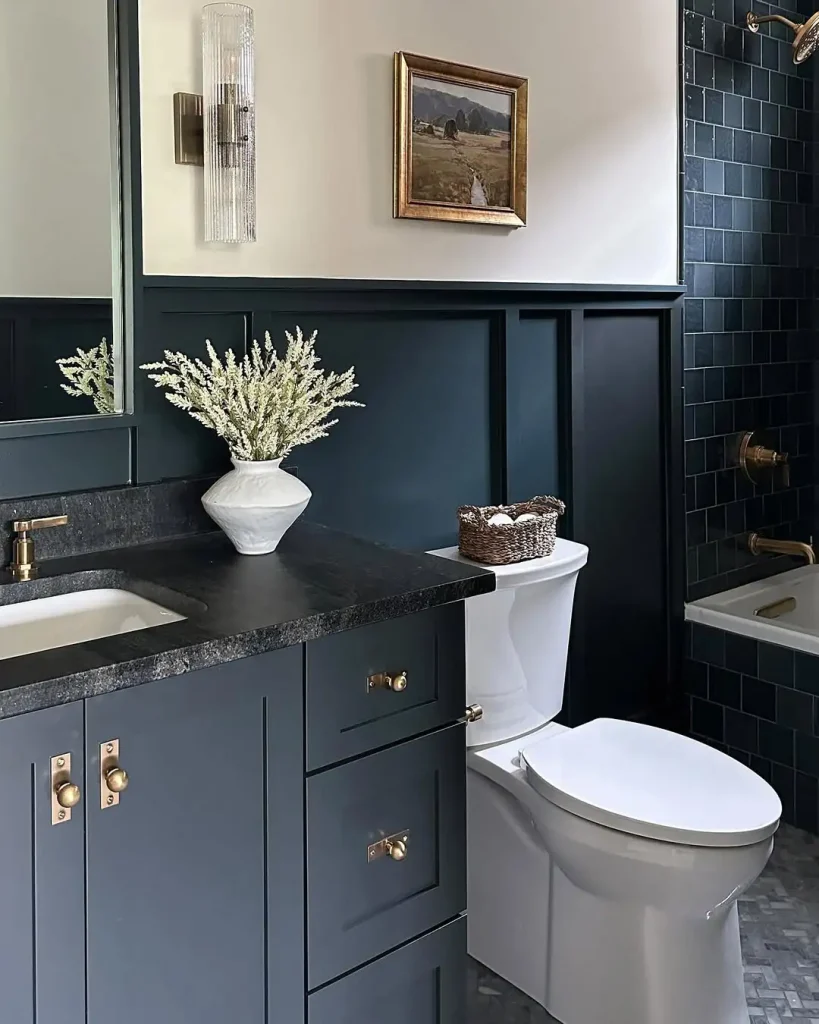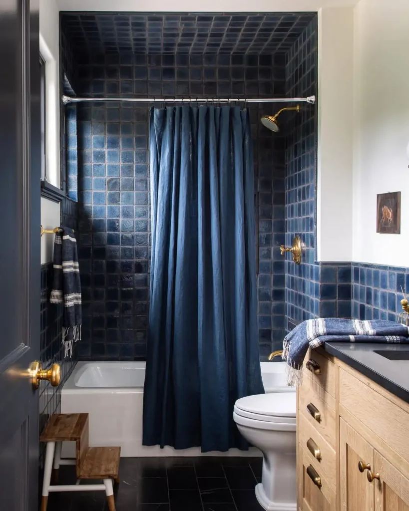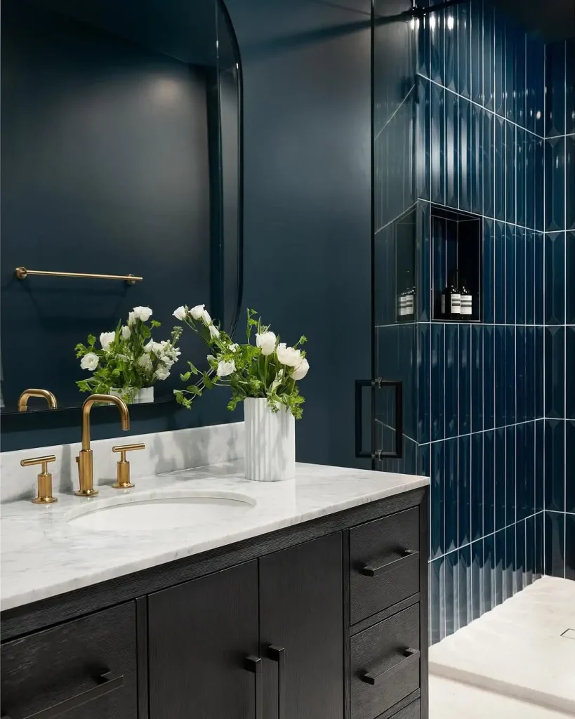 - حمام متوسط و بزرگ: آبی تیره (سرمهای، نیلی، کبالت) خیلی شیک میشه، به شرطی که کنارش نور گرم و رنگ روشن داشته باشی.