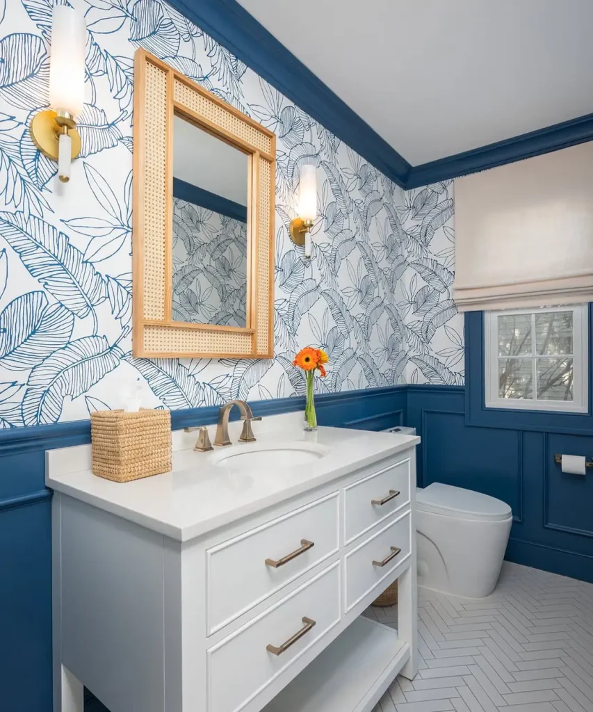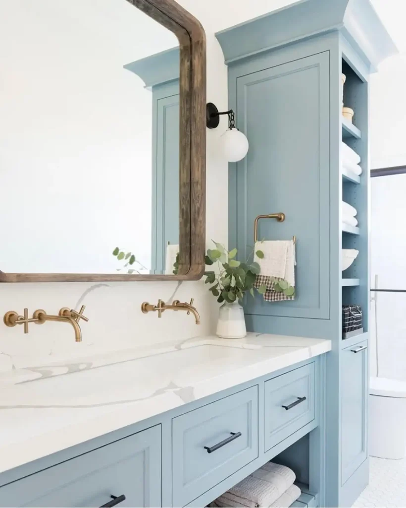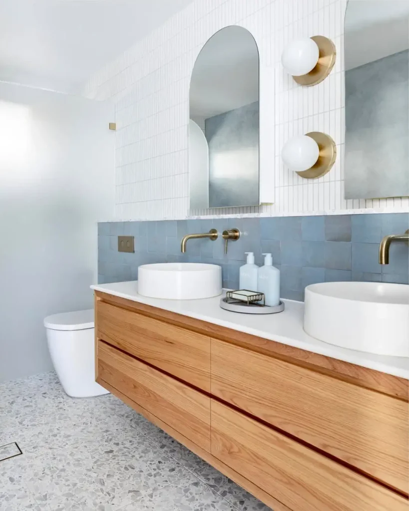 نکتهی مهم اینه که آبی را بهعنوان «قهرمان» یا «چاشنی» انتخاب کنی: یا دیوار/کاشی اصلی آبی باشه و بقیه ساده، یا آبی فقط در کابینت، آینه، اکسسوری و جزئیات بیاد تا فضا خستهکننده نشه.