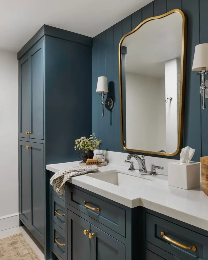اگر نورپردازی درست داشته باشی و کنار آبی تیره از سفید، سنگ روشن، آینه بزرگ و فلزات گرم مثل برنجی/طلایی استفاده کنی، اتفاقاً خیلی لوکس و دنج میشه، نه دلگیر.