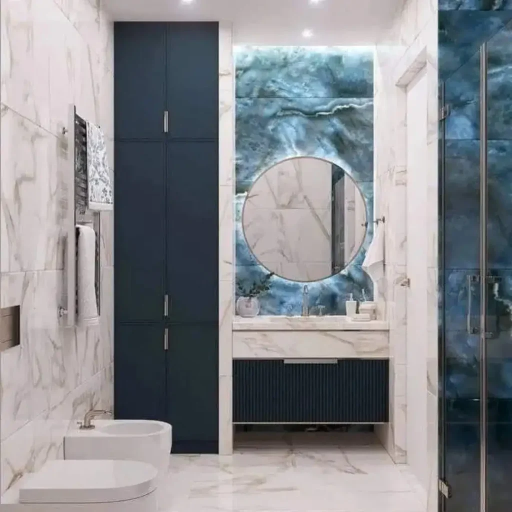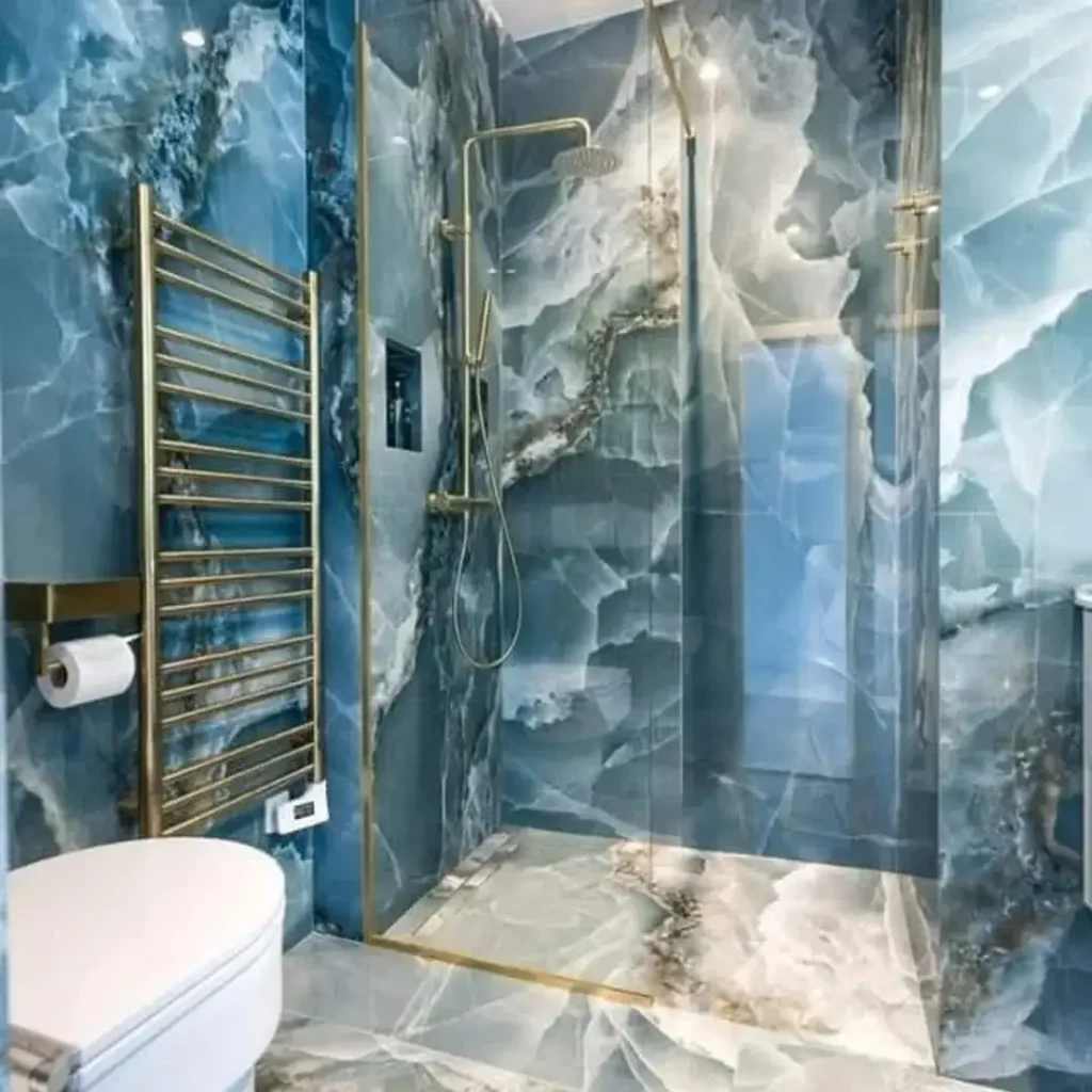 تصور کن وارد دوشی میشی که انگار داخل یک سنگ قیمتی قدم گذاشتی: اونیکس آبی با رگههای سفید و ذغالی، همه جا رو گرفته و یک الگوی هیپنوتیزمکننده ساخته.