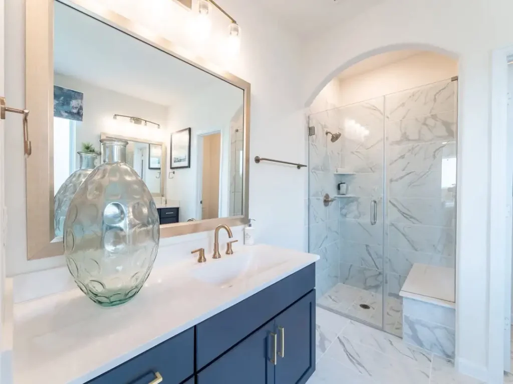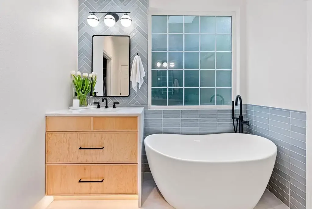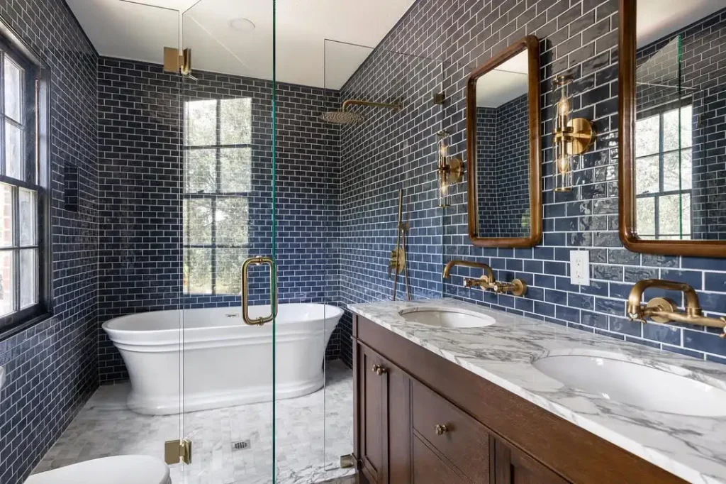 - اگر دوست داری حمام واقعاً آبی دیده بشه، یک بخش اصلی رو آبی کن: مثلاً دیوار دوش، دیوار پشت آینه، یا کاشیهای دور وان.
