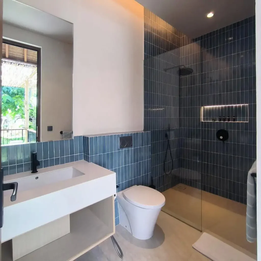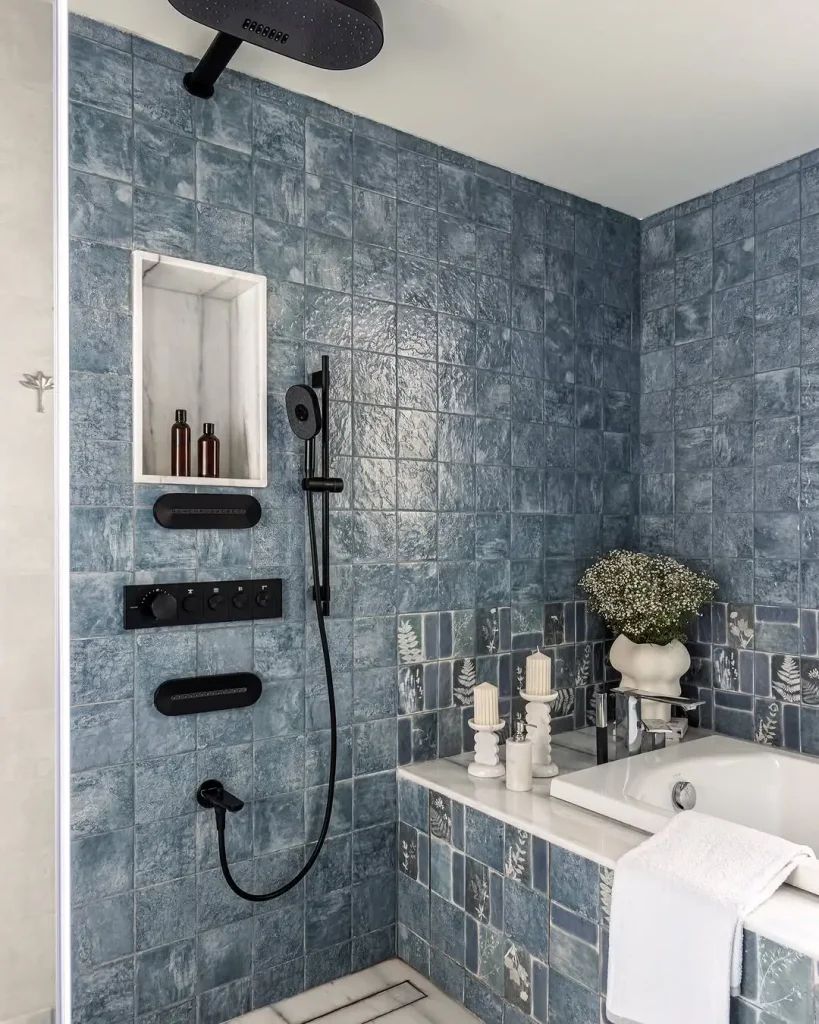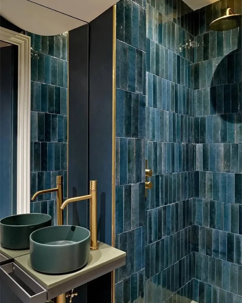 اینجا یک لوکسِ جمعوجور داریم: کاشیهای براق آبی متمایل به سبز، عمودی چیده شدن و حس حرکت و بافت میدن، در حالی که فضا همچنان یکدست و «پیلهای» میمونه.