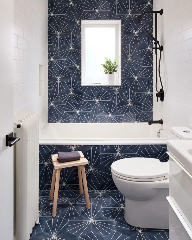 این یکی برای آدمهاییه که از طرح و نقش نمیترسن. کاشیهای پودری آبی با طرح ستارهای/هندسی از کف تا دیوار ادامه پیدا میکنن و یک ریتم جذاب میسازن.
