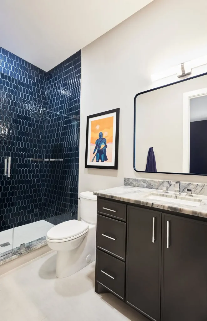 این یکی همون مدلیه که از دیدنش لبخندت میگیره، چون چرا حمام نباید حال آدم رو خوب کنه؟ کاشیهای براق آبی تیره یک انرژی خاص و امروزی دارن و اون تابلو یا اثر هنری جسور هم دقیقاً کار رو کامل میکنه.